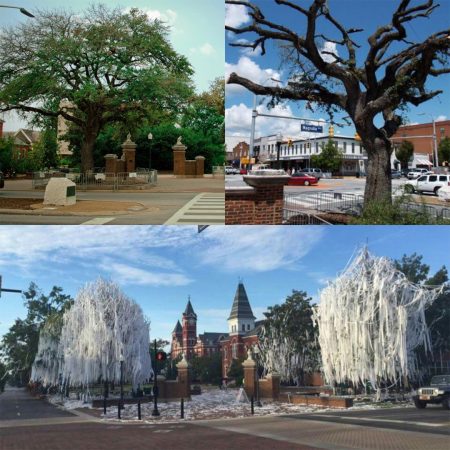 The original Toomer’s Oaks, named affectionately after the owner of a historic drugstore on the corner, stood at the heart of the Auburn Campus. The almost 40-foot-tall trees were significant for a few reasons. Their age: over 80-years-old, and their role in a half-century-old football tradition. When Auburn won a football game, fans would “roll” the trees in toilet paper from top to bottom.